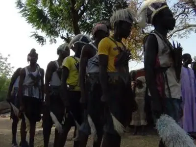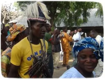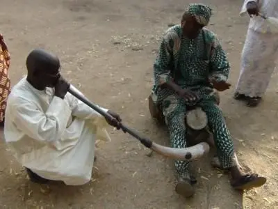Below is a slide show of Ga'anda traditional instruments, men and women singing and dancing, most important headdress, pot drum and horn pipe.